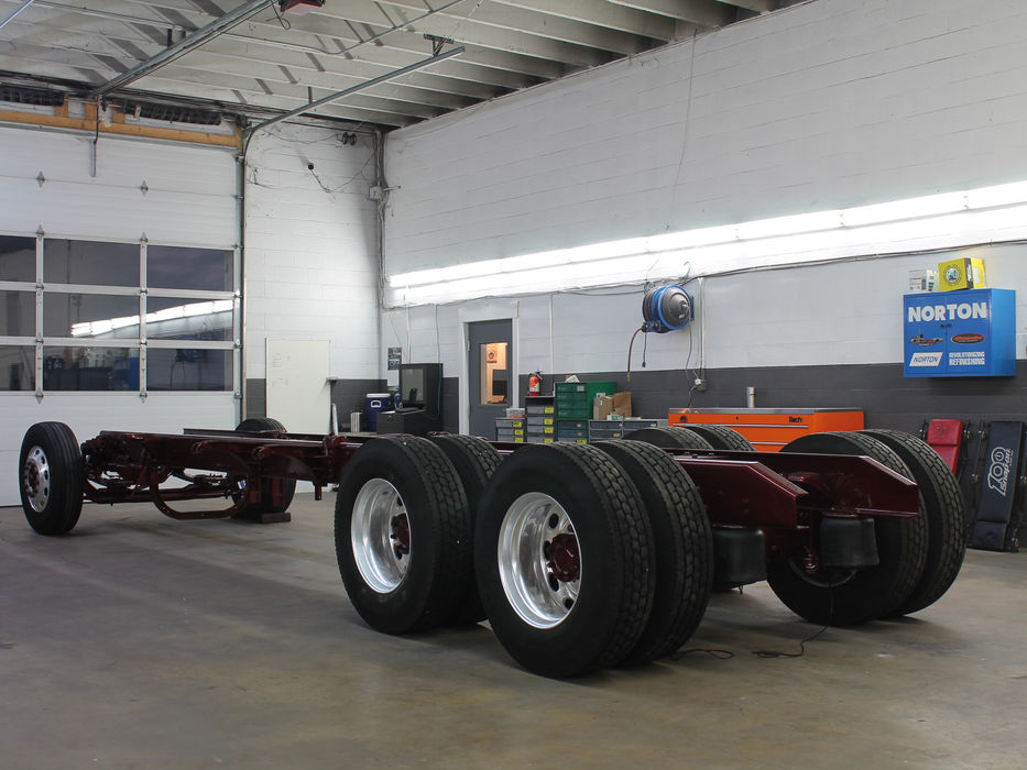 A 1999 379 Peterbilt was made new again with all of the 90's greatest hits and upgraded modifications done where necessary. The chassis was built with new frame rails, air ride, car hauler front axle, new style low air leaf rear axles, and disc brakes all around. New plumbing and wiring were replaced after the Cat C15 was rebuilt and paired with a new 18 speed transmission. New panels throughout the hood, cab, and sleeper were sprayed with a red metallic paint. Many new stainless parts and lights were strategically placed for the modified, classic Peterbilt style that we love. A new black and red interior tied it all together.