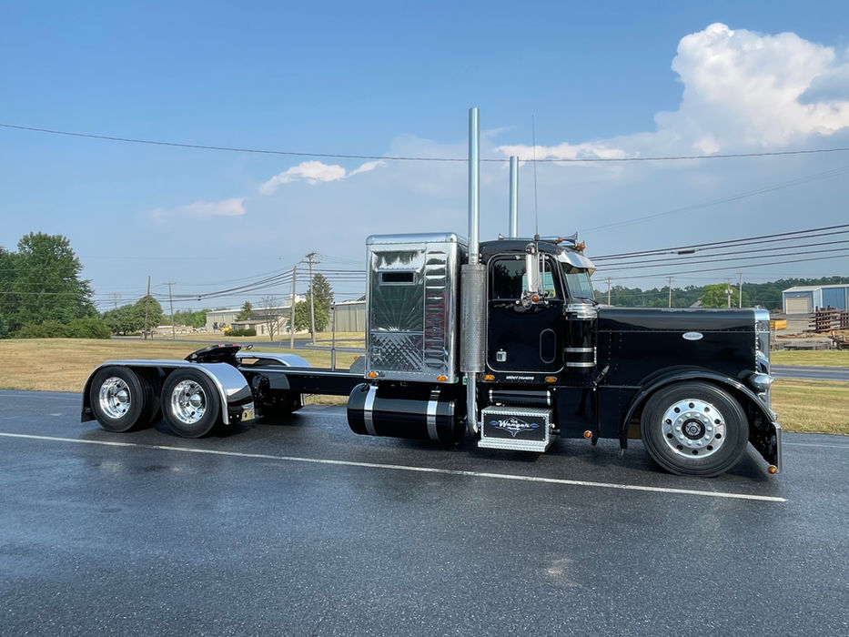 Cool and full of character. We brought some new life back into this 2003 379 Peterbilt by replacing the frame rails, adding new fuel tanks, installing full fenders, fabricating the rear light panel, installing a new deck plate and painting it to match. Then painting the air tanks and air cleaners and installing a new stainless sun visor!